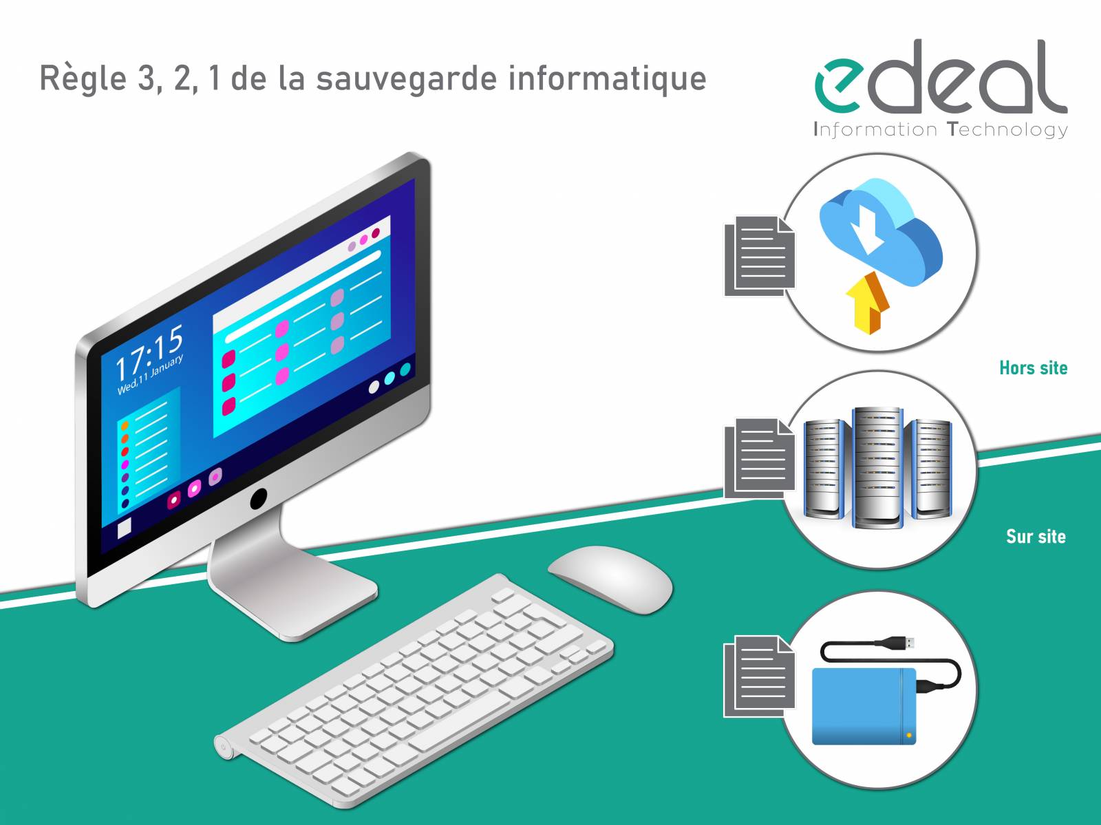 Chez Edeal-IT nous recommandons à nos clients de protéger leurs données informatiques en utilisant la règle de sauvegarde 3, 2, 1 :